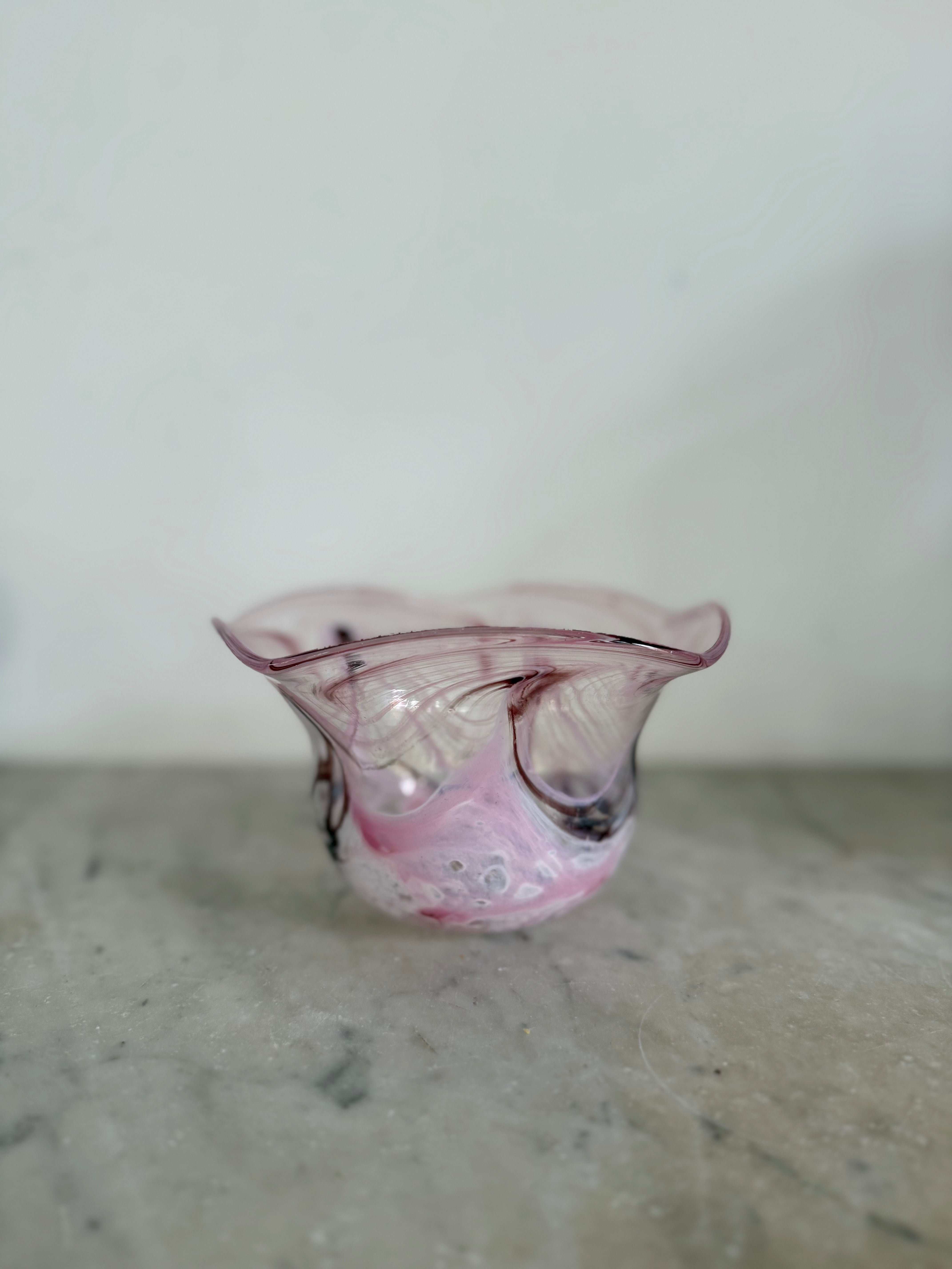 Beautiful mid century Italian sommerso and millefiori-inspired glasswork with a ruffled rim. Given its hand-constructed form, it's entirely unique.